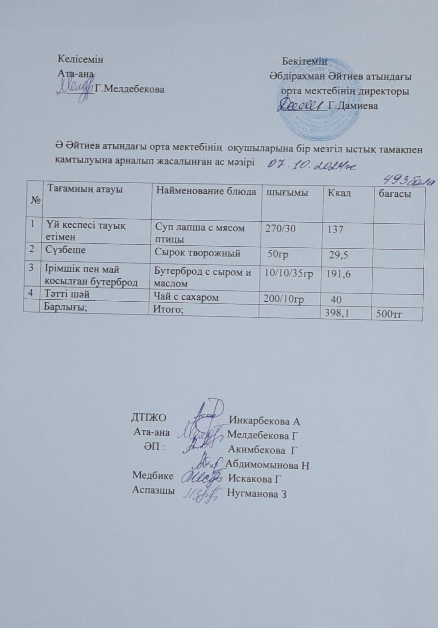""2024-2025 оқу жылы 7-қазан күніне арналған аз мәзірі"" » Әбдірахман Әйтиев атындағы орта мектебі