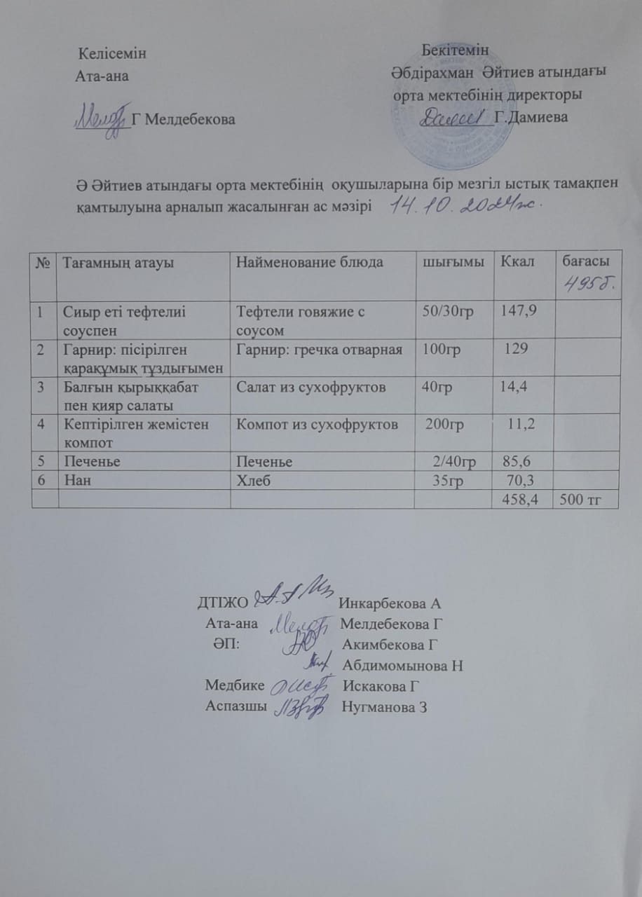 2024-2025 оқу жылы 14- қазан күніне арналған ас мәзірі » Әбдірахман Әйтиев атындағы орта мектебі