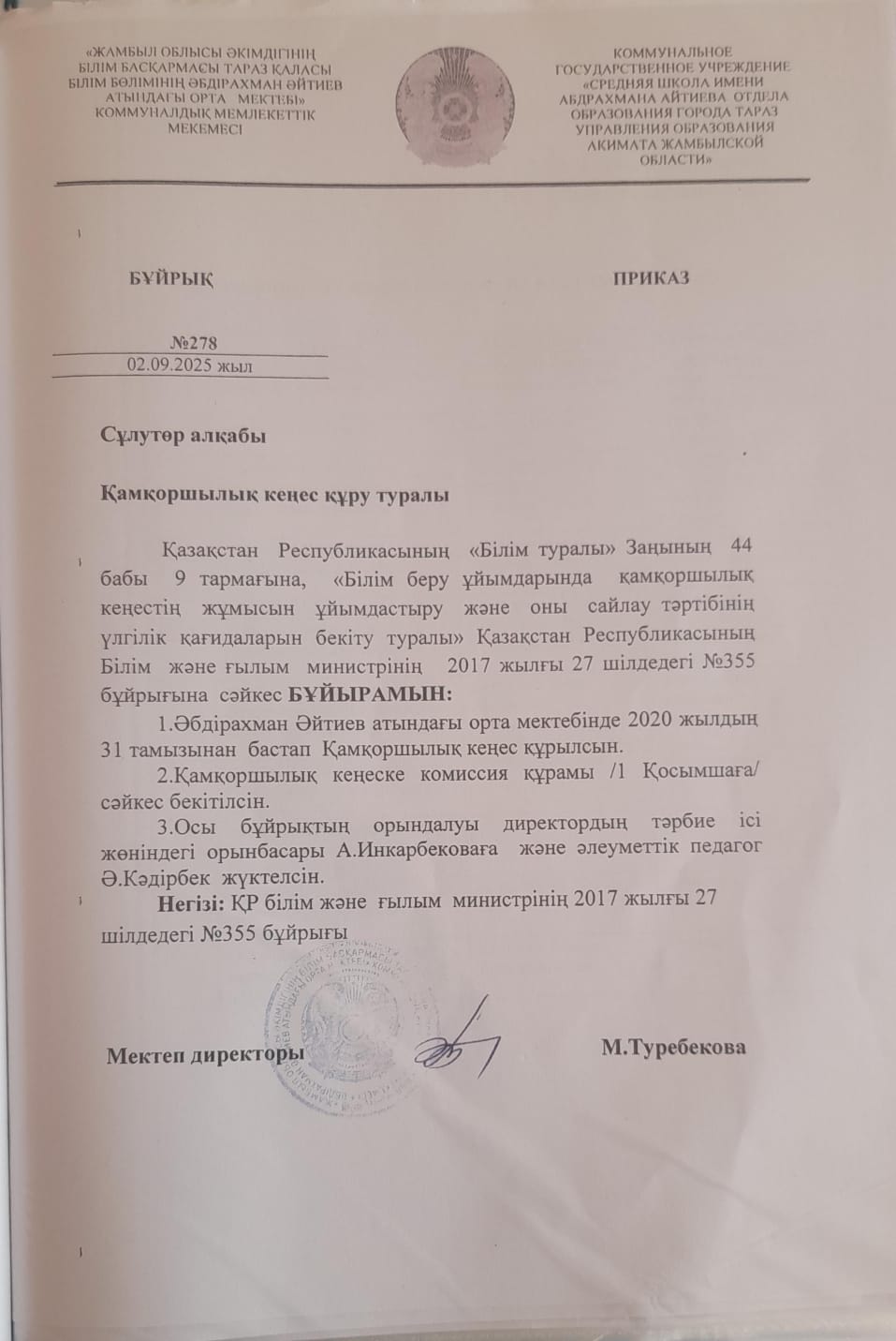 2025-2026 оқу жылы Қамқоршылық кеңесін құру туралы бұйрық » Әбдірахман Әйтиев атындағы орта мектебі